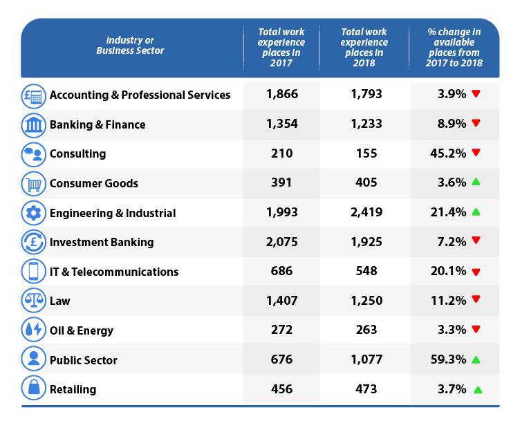 On the other end of the scale, with 55 less openings in 2018 (155) compared to 2017 (210), the lucrative field of consulting has seen the most significant decrease (45.2%) in work experience options for undergraduates. Just slightly above, information technology and telecommunications has seen the next most notable fall (20.1%) in work experience places this year (548) in contrast to 2017 (686).