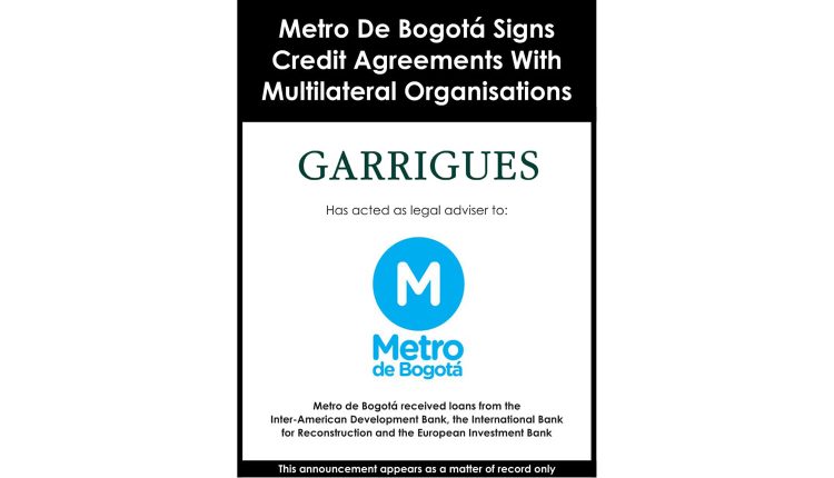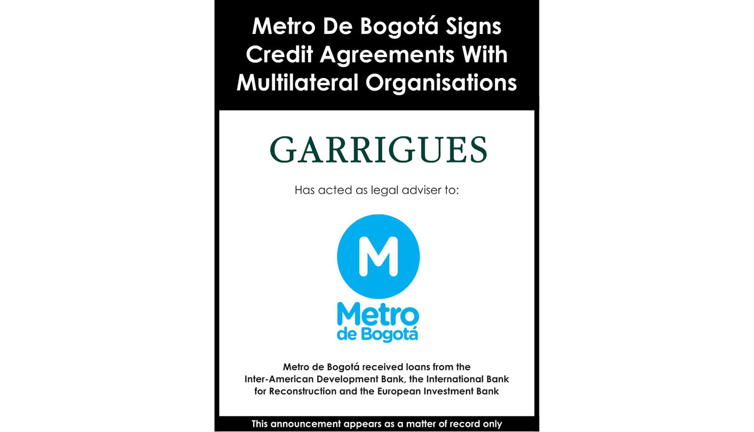 Garrigues Colombia advised Financiera de Desarrollo Nacional (“FDN”) as structuring agent and Empresa Metro de Bogotá S.A. ("EMB") in the negotiation of credit agreements with multilateral organizations in order to obtain financial resources for the development of the first line of the Bogota Sustainable Subway.