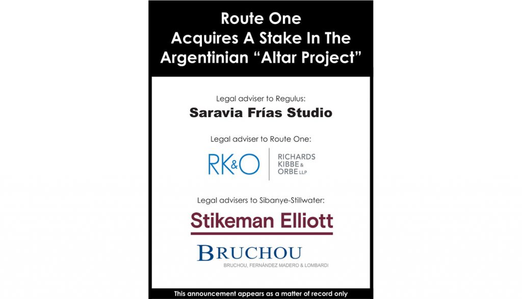 I was involved as the local lawyer of Regulus Resources Inc in Argentina. Our work basically consists in advising our client on the implementation of the Joint Venture from an Argentinean law perspective and performing a due diligence on Minera Peregrine S.A. (Sibanye/Stilwater`s Argentinean Subsidiary) and its mining titles in the Altar Project.