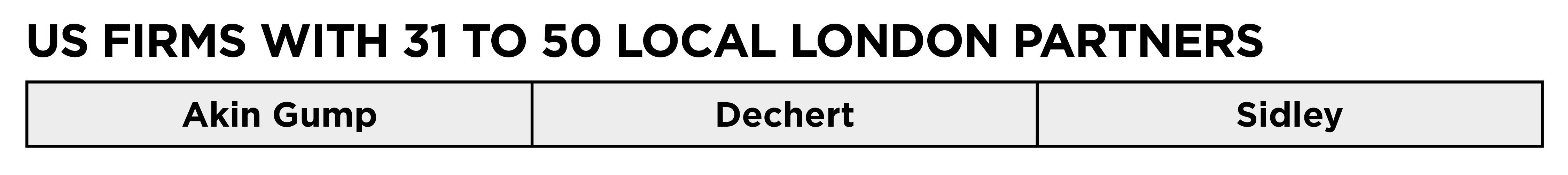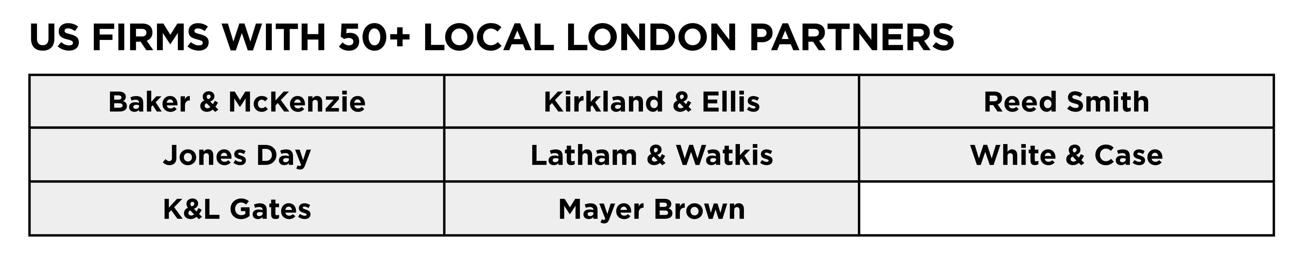 The majority of the seventy-one Am Law 100 Firms with an English-law capability have offices with less than 20 partners. You will see from the list above that several big and highly profitable brands fall into this grouping. Their London offices have shown slow incremental headcount growth over many years and there are no signs that this is going to change in the near future.