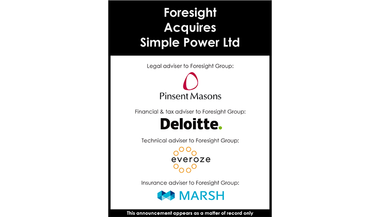 Foresight Group LLP (“Foresight”) announced the acquisition of 100% of the equity of Simple Power Limited (“SPL”) for an undisclosed sum, comprising a portfolio of 52 onshore sub-250kW single wind turbines located across Northern Ireland.