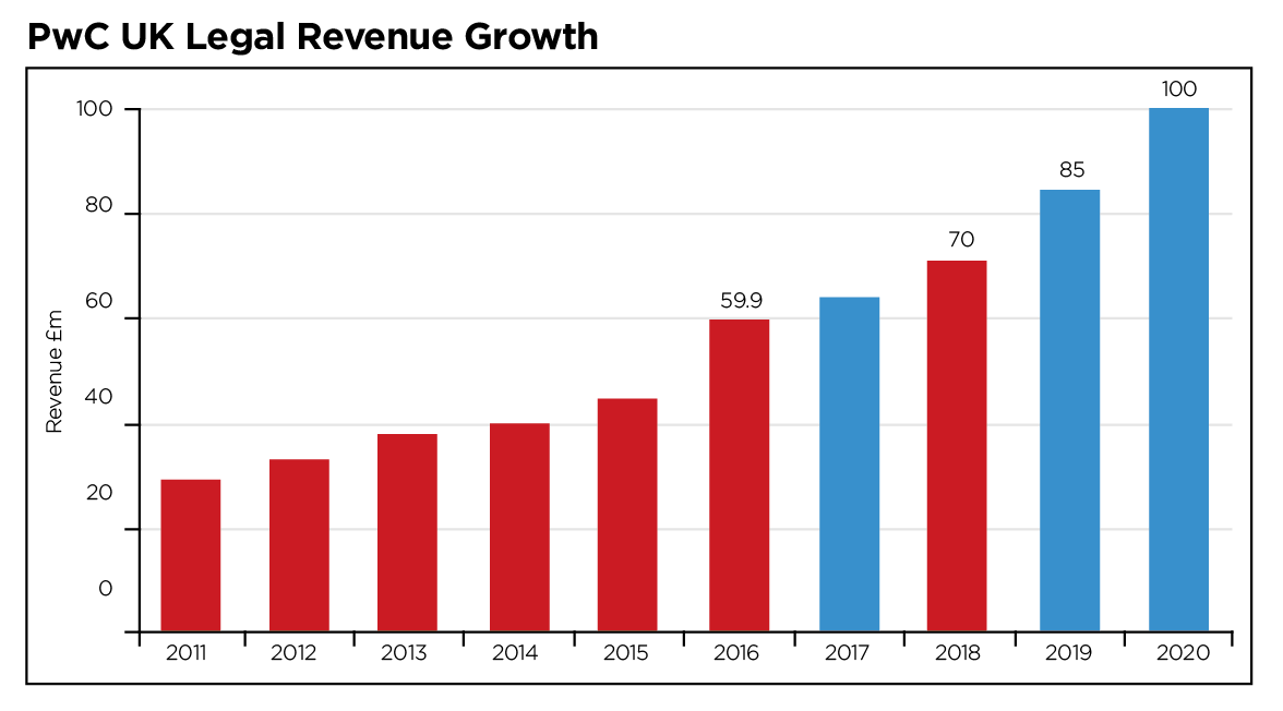 The blue bars are estimates. PwC UK Legal was absorbed into PwC in 2016 and separate accounts are no longer available. The 2020 figure of £100m was reported in 2015 as a target.