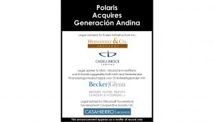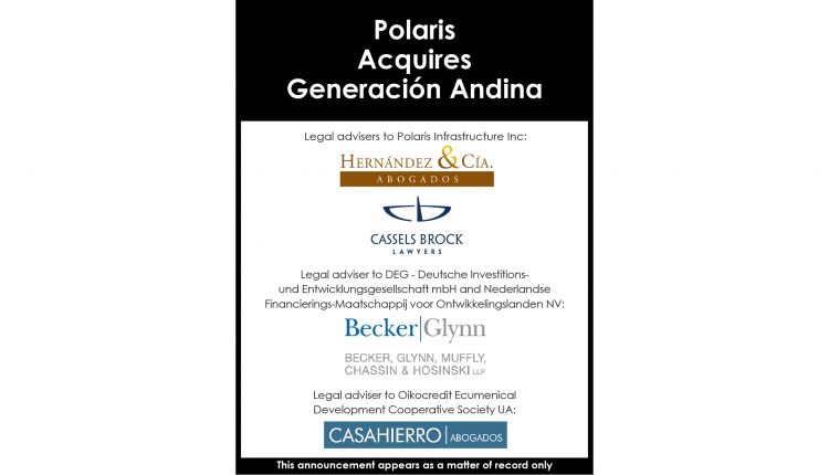 In connection with the Polaris acquisition, Becker, Glynn, Muffly, Chassin & Hosinski LLP advised on certain aspects of the transaction, doing work related to restructuring an existing financing of a UEG subsidiary involved in the Generación Andina projects. The firm acted as New York international transaction counsel to Nederlandse Financierings-Maatschappij voor Ontwikkelingslanden N.V. (“FMO”) and DEG - Deutsche Investitions- und Entwicklungsgesellschaft mbH ("DEG" and, together with FMO, the "Lenders") and DEG as Agent in connection with financing that the Lenders had extended in 2015 to Generación Andina S.A.C., a project company controlled by UEG (the “Financing”).