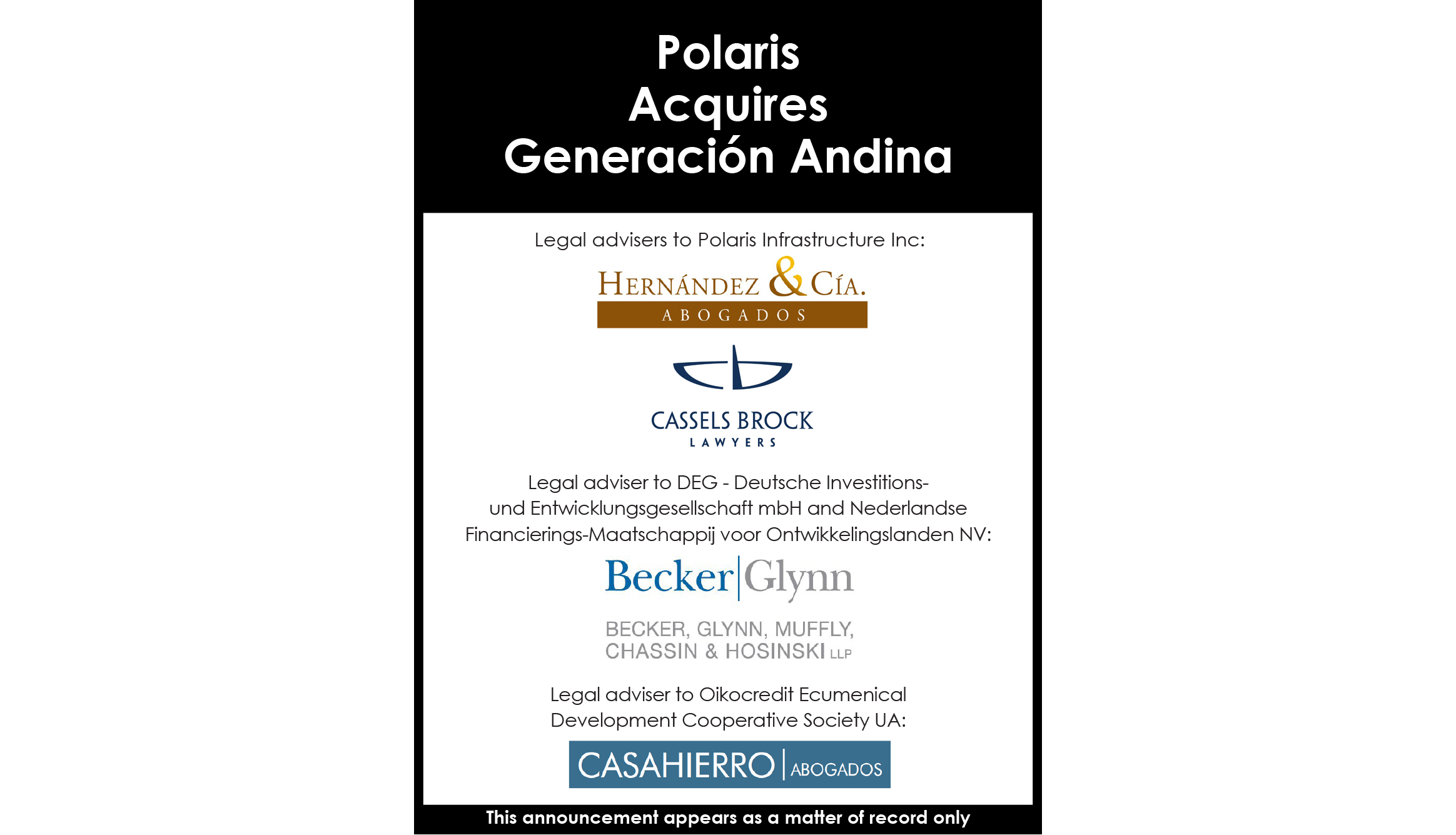 We are very pleased to have completed this transaction" stated Marc Murnaghan, Chief Executive Officer of Polaris Infrastructure, "which we expect will provide numerous benefits to the Company and its shareholders.”