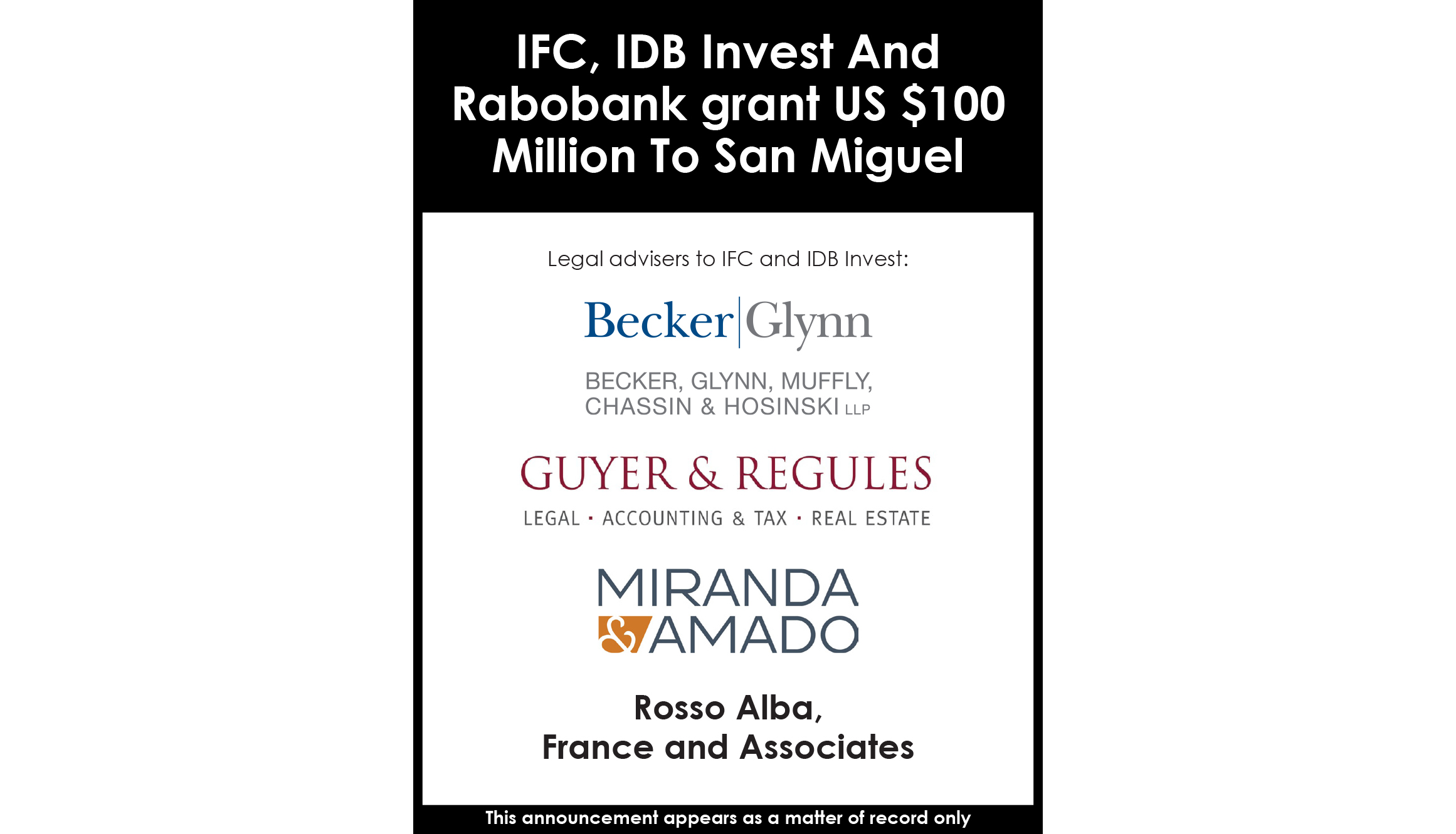 The package consists of $27.5 million from each IDB Invest and IFC, and $45 million from Rabobank. IDB Invest and IFC will also advise San Miguel on good environmental practices in key areas, such as the treatment of wastewater.