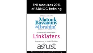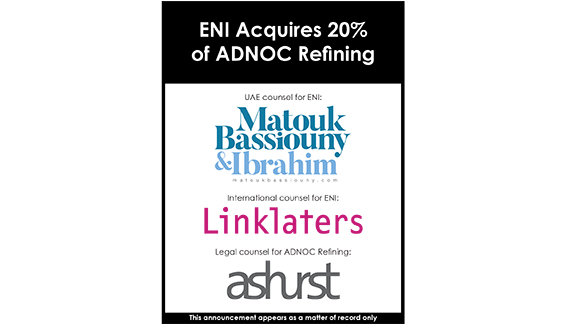 ADNOC also announced that it sold to OMV a 15% equity interest in ADNOC Refining, with ADNOC retaining the remaining 65%. ADNOC, Eni and OMV also agreed to establish a Trading Joint Venture with the same shareholding of ADNOC Refining.