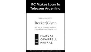 Becker, Glynn, Muffly, Chassin & Hosinski LLP acted as international transaction counsel to IFC for this financing, having previously worked with IFC on a 2016 financing of a Telecom Argentina subsidiary. The Becker Glynn team was led by partner Peter Hosinski, with primary assistance from associate Andres Sardi. Partner Rachel Wasserman, counsel Kenneth Stuart, and foreign associate Helena Romero also offered assistance to the team.
