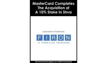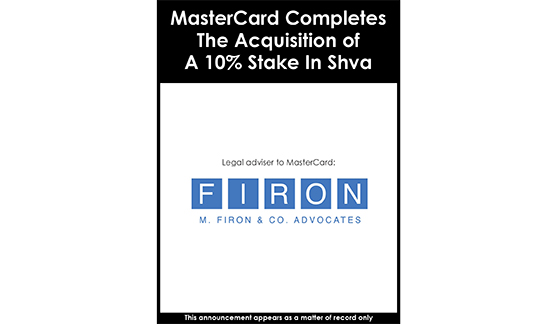 MasterCard completed the acquisition 10% of Shva (automated bank services) from Bank Hapoalim for $11 million. MasterCard was represented by Advocates Eytan Epstein and Shirley Dahan together with the Head of Competition and Regulation Department, Mazor Matzkevich and Yehuda Gindi, a Partner in M. Firon & Co. Advocate’s capital markets department.