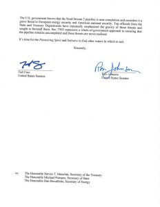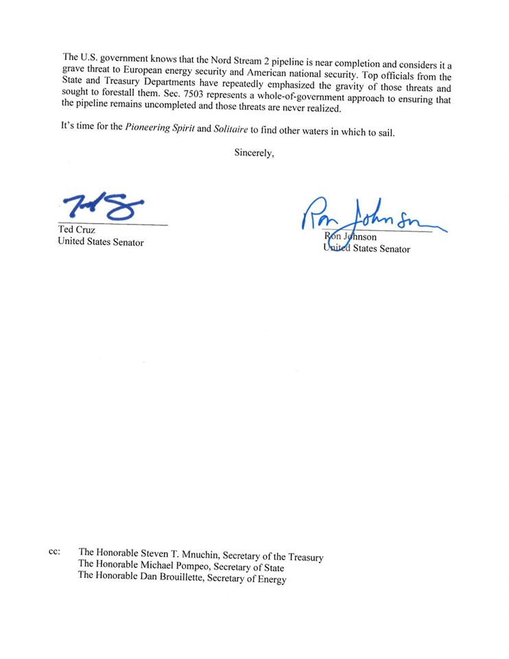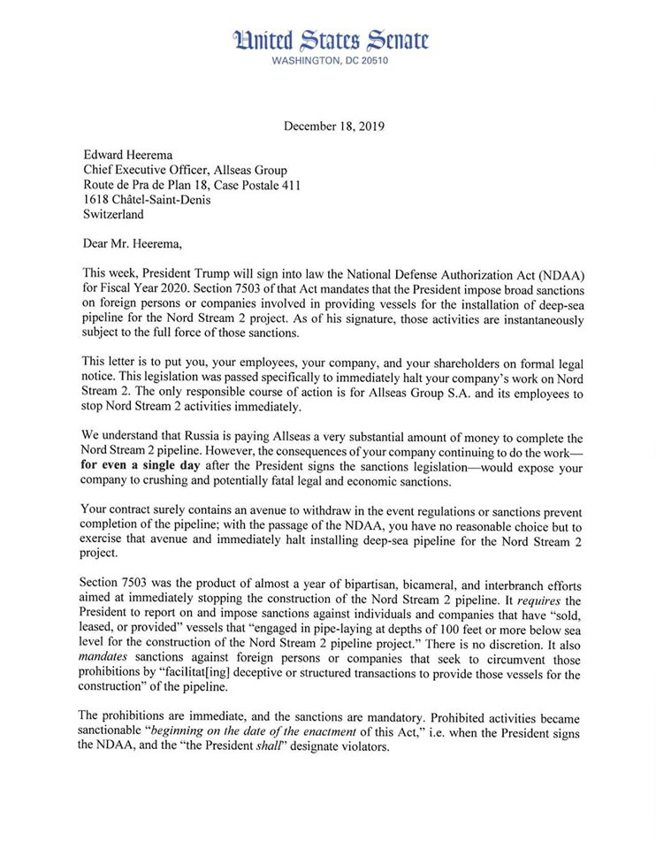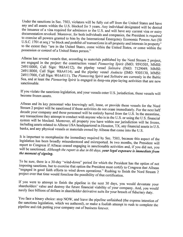 "We understand that Russia is paying Allseas a very considerable amount of money to complete the Nord Stream 2 pipeline. However, the consequences of your company continuing to do work – for every single day after the President signs the sanctions legislation – would expose your company to crushing and potentially fatal legal and economic sanctions.”