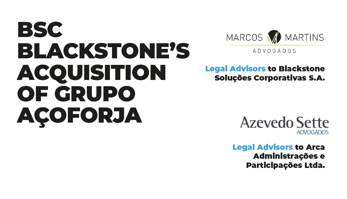 The investment company BSC – Blackstone Soluções Corporativas, which operates as an investment company in Brazil, bought all the shares of Grupo Açoforja - a medium/heavy capacity open Forging Company, which manufactures steel forgings, such as parts underdrawing, pre-machined (rough machined) or finished machined, and heat-treated parts.