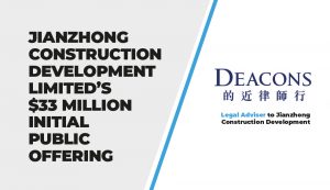 Deacons had advised Jianzhong Construction Development Limited on its Main Board IPO. Their team was led by Ronny Chow and Gary Wong, Partners of the Corporate Finance Practice Group.