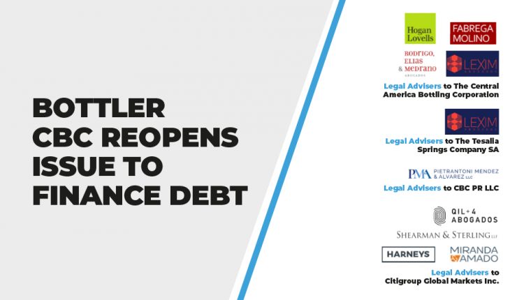 The company will upsize its $500 million 5.750% senior notes due 2027 (by an additional $200 million add-on). The net debt proceeds of the issuance will be used to refinance debt, support its cash balance, productive investments and for general corporate purposes, including potential future acquisitions. Legal advisers to The Central America Bottling Corporation were Hogan Lovells as lead international counsel having other local Latam Firms involved such as Consortium Legal, Rodrigo, Elías & Medrano Abogados, Benjamín Valdez & Asociados and Fábrega, Molino & Mulino and LEXIM Abogados, the later been also outside counsel to The Tesalia Springs Company SA.