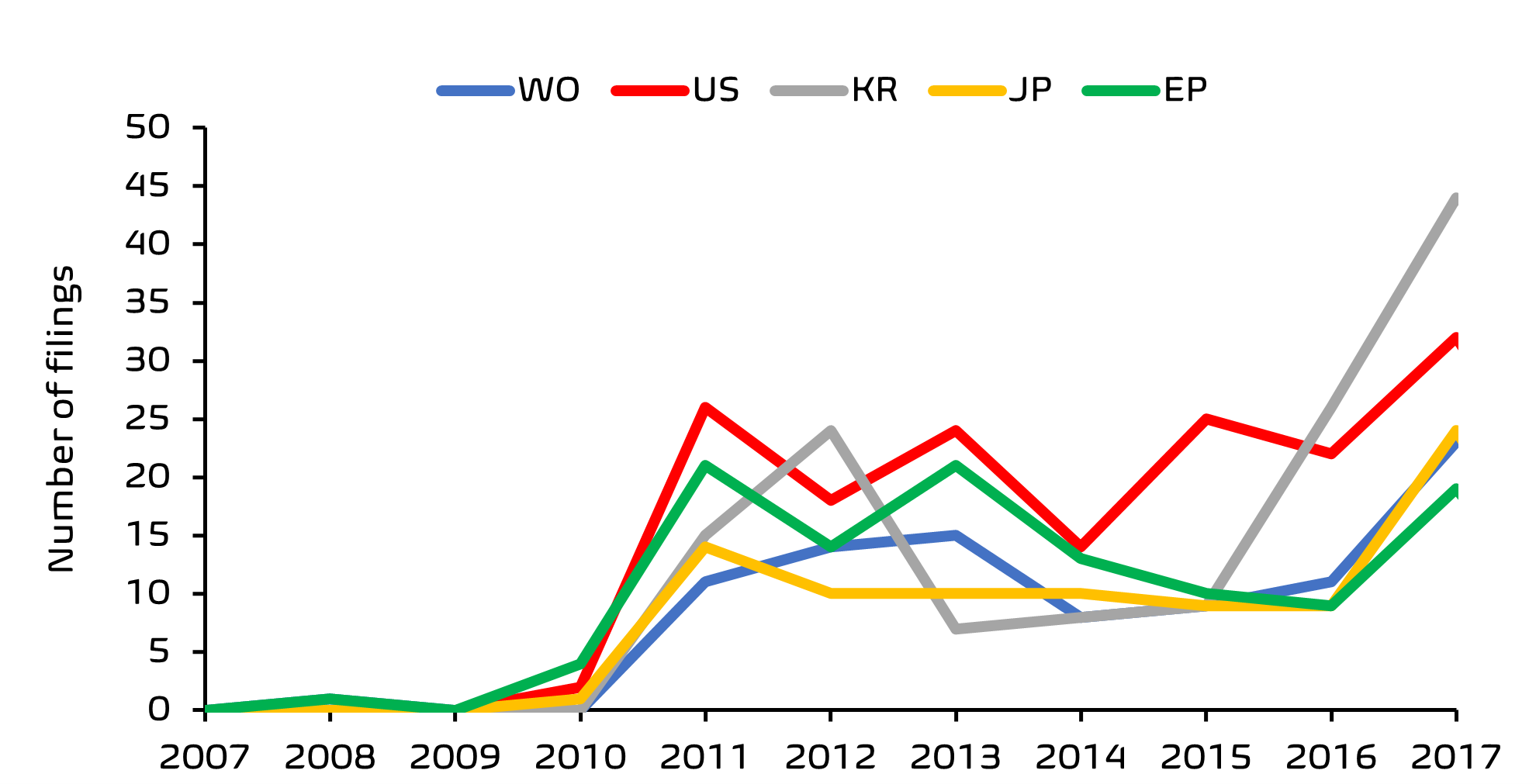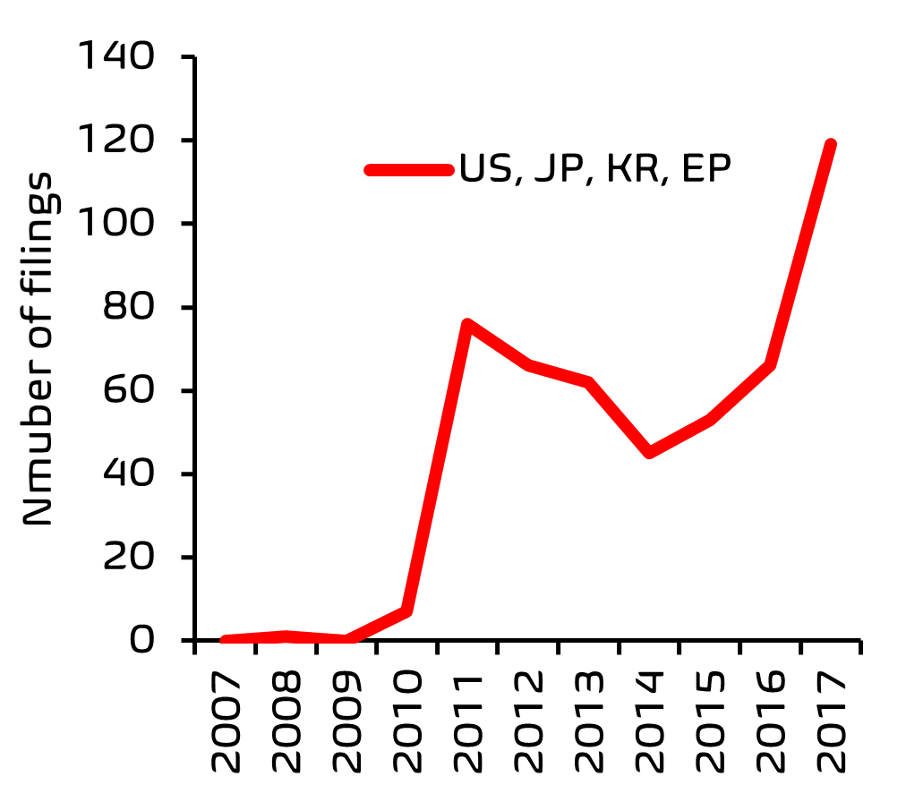 From this search, it was clear that there has been a significant acceleration in filing activity, with the European Patent Office (EPO) being one of the top five patent offices receiving these filings.