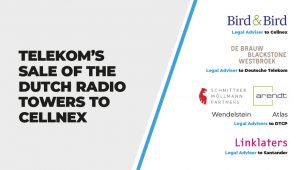 Bird & Bird acted as legal advisers to Cellnex Telecom on this transaction. M&A partner Pauline Vos led the Bird & Bird team. She was assisted by Marinke Moeliker (corporate/M&A), Janneke Kohlen, Mariska van de Sanden and Tialda Beetstra (antitrust), Willem Bongaerts (tax), Jeroen van der Lee and Lisette den Butter (commercial) and Feyo Sickinghe (regulatory).