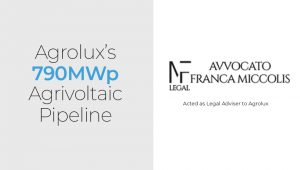 MFLegal assisted Agrolux Group, a leading developer in the photovoltaic sector, in the negotiation and signing of a framework agreement for the development and sale to a primary European operator in the sector with over 2.3 GWp of global installed capacity in relation to a pipeline of agrivoltaic projects in development course, with a total expected power of up to 790 MWp located in Sardinia, and in the completion of the first closing related to a first set of projects for 207 MWp.
