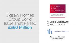 Beever and Struthers, headquartered in Manchester and with offices in Blackburn, Birmingham, and London, acted for Jigsaw on raising the cash via the bonds market. The firm provided key input into the process through verification of financial information in the bond prospectus that was issued to potential investors and confirmation of the financial position of the group. Savills, Addleshaw Goddard and Trowers & Hamlin also advised on the transaction.