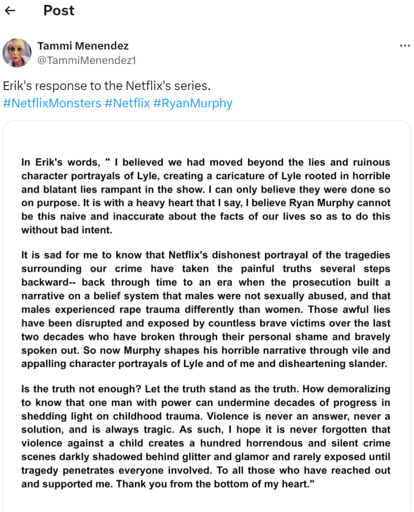 “I believed we had moved beyond the lies and ruinous character portrayals of Lyle, creating a caricature of Lyle rooted in horrible and blatant lies rampant in the show,” Erik, 53, said in a statement shared by his wife, Tammi Menéndez, via X on September 19, the same day the Netflix series premiered. “I can only believe they were done so on purpose. It is with a heavy heart that I say, I believe Ryan Murphy cannot be this naive and inaccurate about the facts of our lives so as to do this without bad intent.”