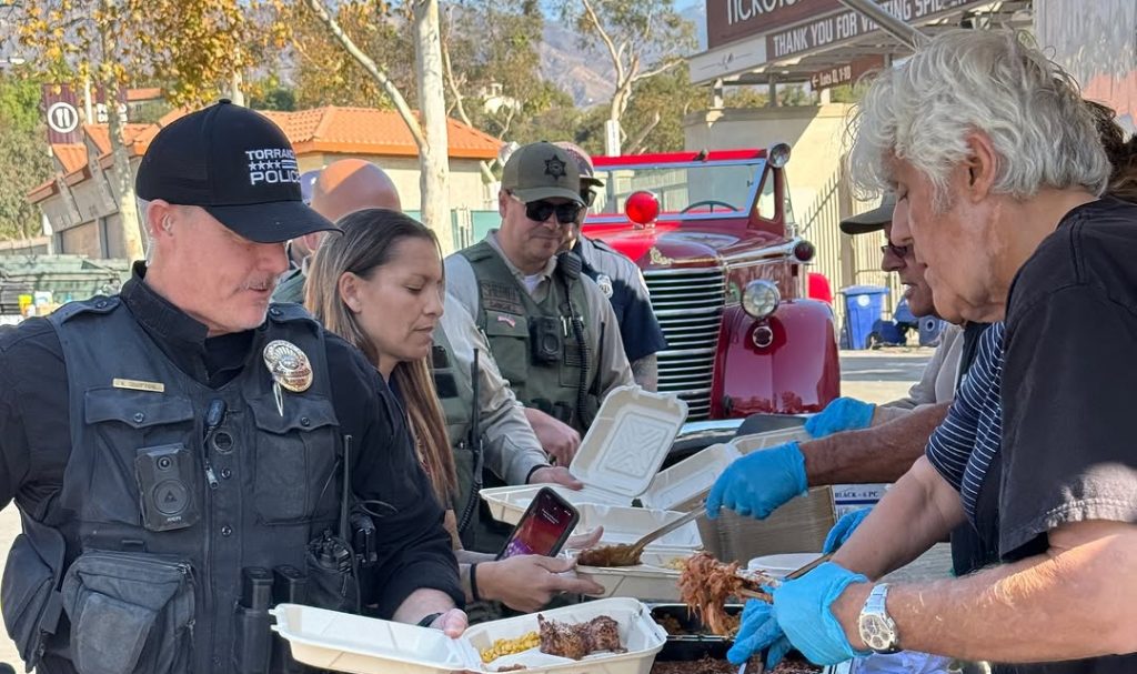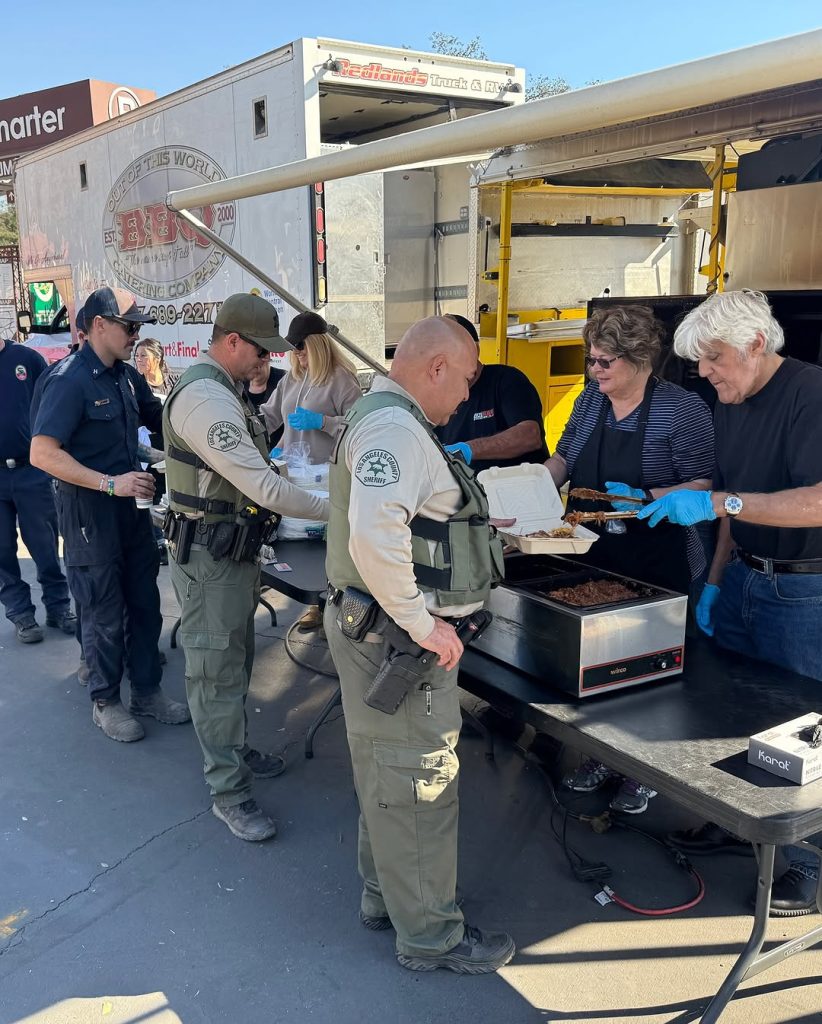 In footage of his Palisades visit, Leno can be seen serving steaming BBQ cuisine to a line of firefighters.