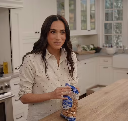 Fallon’s joke referenced a scene from Markle’s Netflix show, which began streaming on March 4. In this particular segment, the Duchess of Sussex transfers pre-packaged pretzels from a store-bought bag into a custom bag with a personal label, offering the snacks to visiting guests.