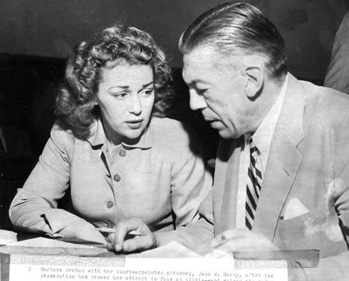 Barbara Graham confers with her court-appointed attorney, Jack W. Hardy, after her attempt to fake an alibi undermined the defense.