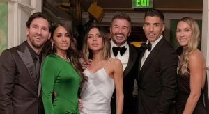 "Stars turned out in style for David Beckham’s 50th birthday, including Lionel Messi, Antonela Roccuzzo, Victoria and David Beckham, Luis Suárez, and Sofia Balbi—pictured together in a standout group shot.