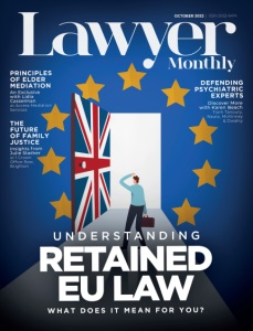 After a searing summer, the temperature is turning steadily colder as we approach the end of the year and prepare for the promise of new things to come. This month’s edition is packed with a diverse range of articles, touching upon topics sure to be of interest to legal practitioners and business leaders alike. In our cover feature for this month, we discuss the newly unveiled Retained EU Law (Revocation and Reform) Bill and the impact it has made in the legal sphere, among other emerging UK matters. While overlooked in some corners as national attention is directed towards the economy, parts of the Bill may have a significant effect on both individuals and firms alike. You can find our analysis on page 12. Also featured in this edition are Lidia Casselman, Karen Beach and Julie Stather, who each grace the My Legal Life and Expert Insight sections. Their features discuss elder mediation, psychiatric malpractice defence and family arbitration, all placed in context with the authors’ own advice to less experienced practitioners in these areas. They are all enlightening and well worth a look, even for those unfamiliar with their respective sectors. Elsewhere in this magazine are a broad array of further articles on topics as varied as digital transformation and identifying negligence in nursing homes. In addition to our monthly rundowns on developing legal stories and lawyer moves, the Expert Insight and Thought Leader sections are bursting with inspiring pieces on arbitration, healthcare, personal injury law, legal tech and other sectors. We hope that you enjoy this edition. LAWYER MONTHLY©2022 Universal Media Limited Lawyer Monthly is published by Universal Media Limited and is available on general subscription. Readership and circulation information can be found at: www.lawyer-monthly.com. The views expressed in the articles within Lawyer Monthly are the contributors’ own. All rights reserved. Material contained within this publication is not to be reproduced in whole or in part without prior permission. Permission may only be given in written form by the management board of Universal Media Limited. Approx. 302,000 net digital distribution. Oliver Sullivan Editor Lawyer Monthly Welcome to Lawyer Monthly Magazine OCTOBER 2022 EDITION @lawyermonthly @LawyerMonthly @lawyermonthly company/lawyer-monthly Universal Media Limited, PO Box 17858, Tamworth, B77 9QG, United Kingdom 0044 (0) 1543 255 537 Production Team: Emma Tansey, Luke Ostle, Nathan Athersmith production@lawyer-monthly.com Sales Enquires: Jacob Mallinder Jacob.mallinder@universalmedia365.com