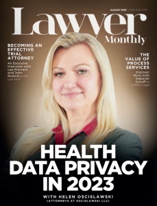 Lawyer Monthly regularly features opeds and news updates tracking the everchanging climate of data regulation and privacy. The pace of technological advancement and its regulatory fallout can be difficult to parse, yet the decisions made by governments and courts in this area affect countless lives. This is true for health data most of all, as its mismanagement could have an especially dire impact upon victims. Our cover story for August 2023 comes from Helen Oscislawski and explores this matter further. A seasoned New Jersey attorney with a wealth of knowledge of the US healthcare sector and its inner workings, Helen takes us through her journey into law, the regulations that govern organisations’ use of health information and what the future may hold for health data and privacy in this exclusive interview. Her insights can be found overleaf. FEATURE OF THE MONTH