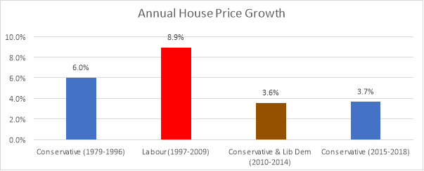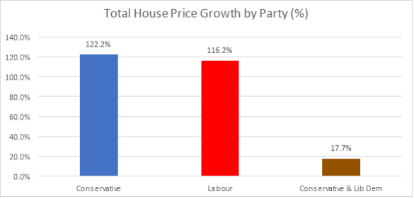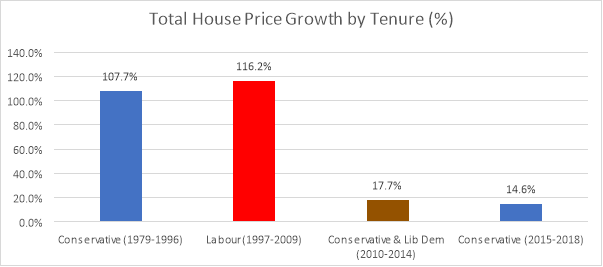 Unfortunately for the Conservative Party, looking at house price growth by tenure tells a different story. Between 1979 and 1996, the Conservative’s presided over a housing market that saw prices increase by 107.7%. The market then went on to see prices rise by 116.2% between 1997 and 2009 under Labour. The Conservative/Lib Dem coalition saw prices rise by just 17.7% during their four years in power, with prices increasing by just 14.6% during the last three years under a Conservative government.